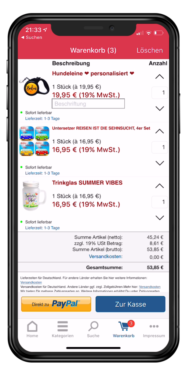 Die Warenkorb-Ansicht zeigt alle Produkte die dein Kunden kaufen möchte. Der Warenkorb ist offline. D.h. nach einem App-Start sind alle Artikel lokal weiterhin hinterlegt, selbst ohne Kundenaccount oder Login.