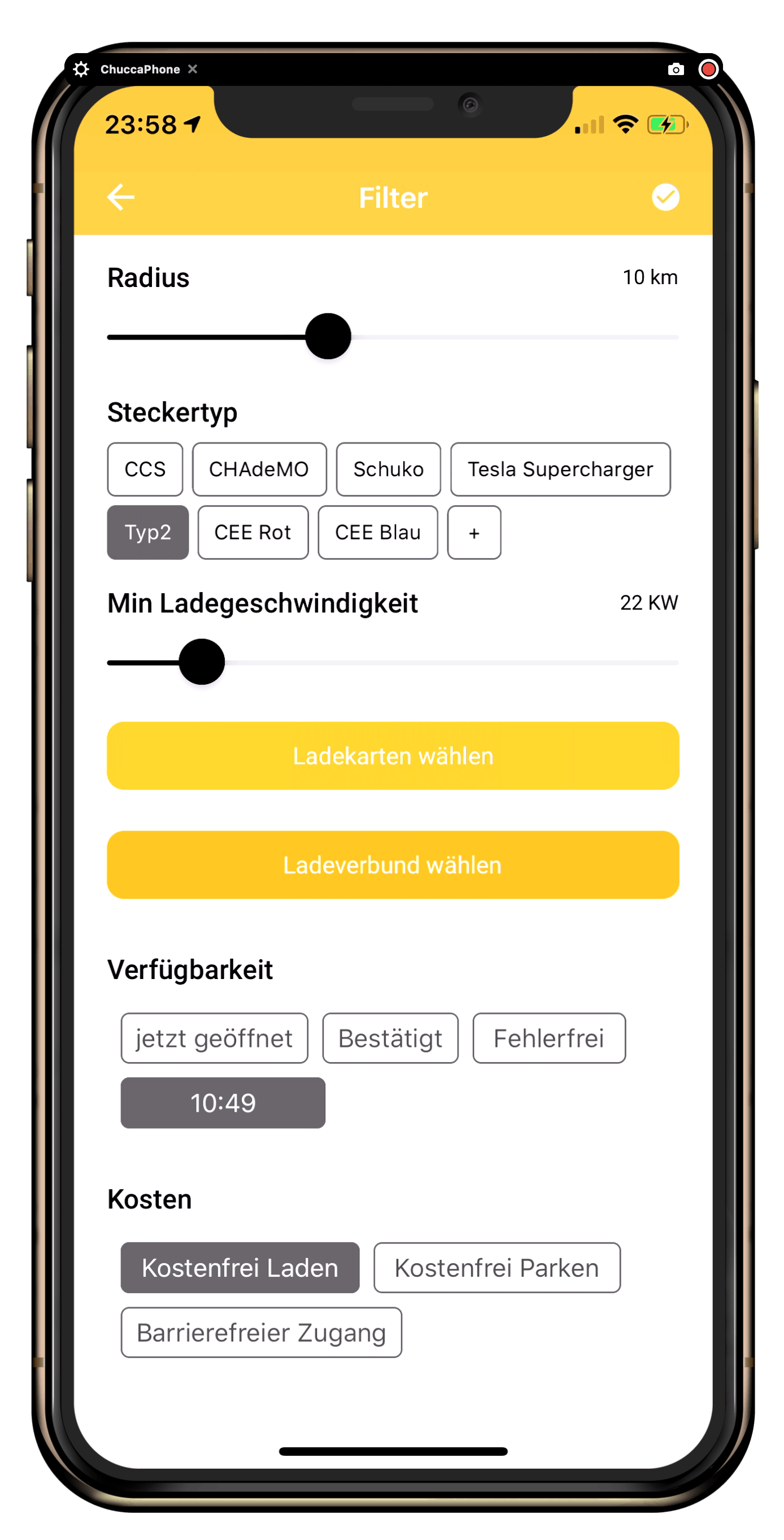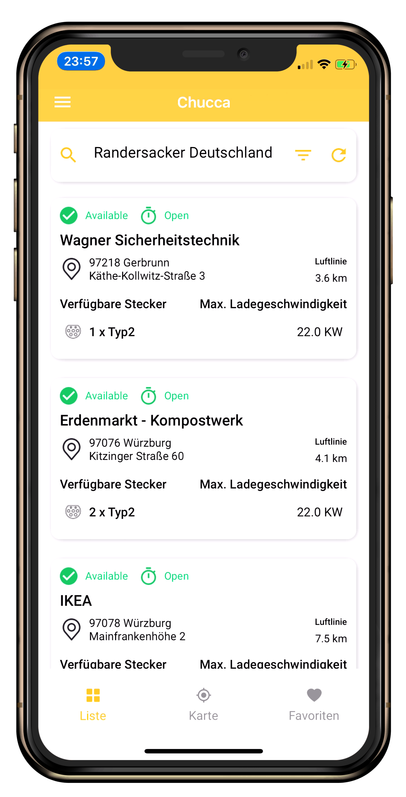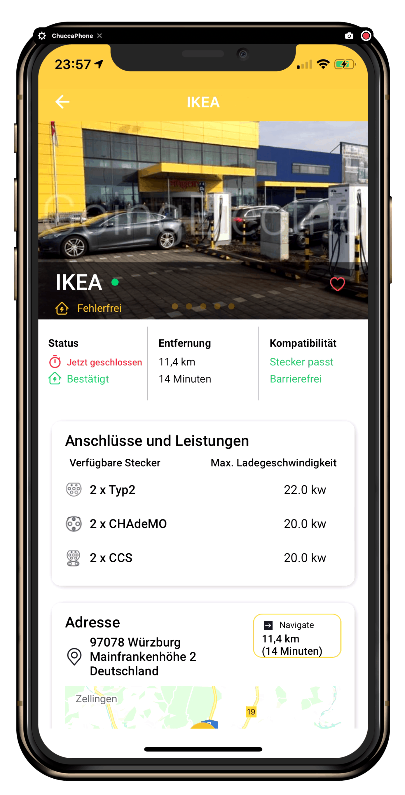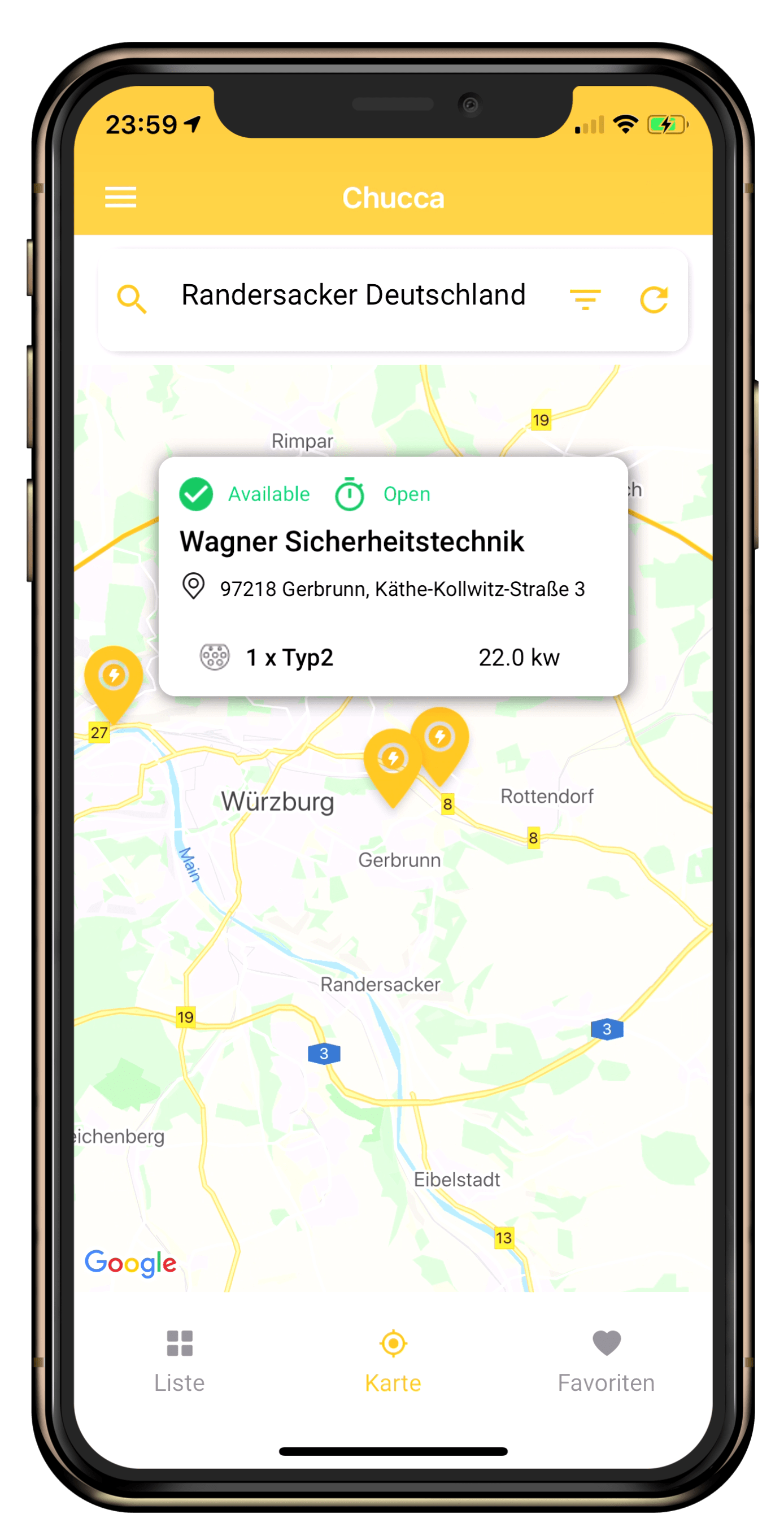 Auf Basis dieser Daten ist unsere App Chucca für iOS und Android entstanden. Die ist an keinen Anbieter gebunden, und zeigt somit alle Ladesäulen an. Damit findest du die größte Auswahl an Lademöglichkeiten auf deinem Smartphone.